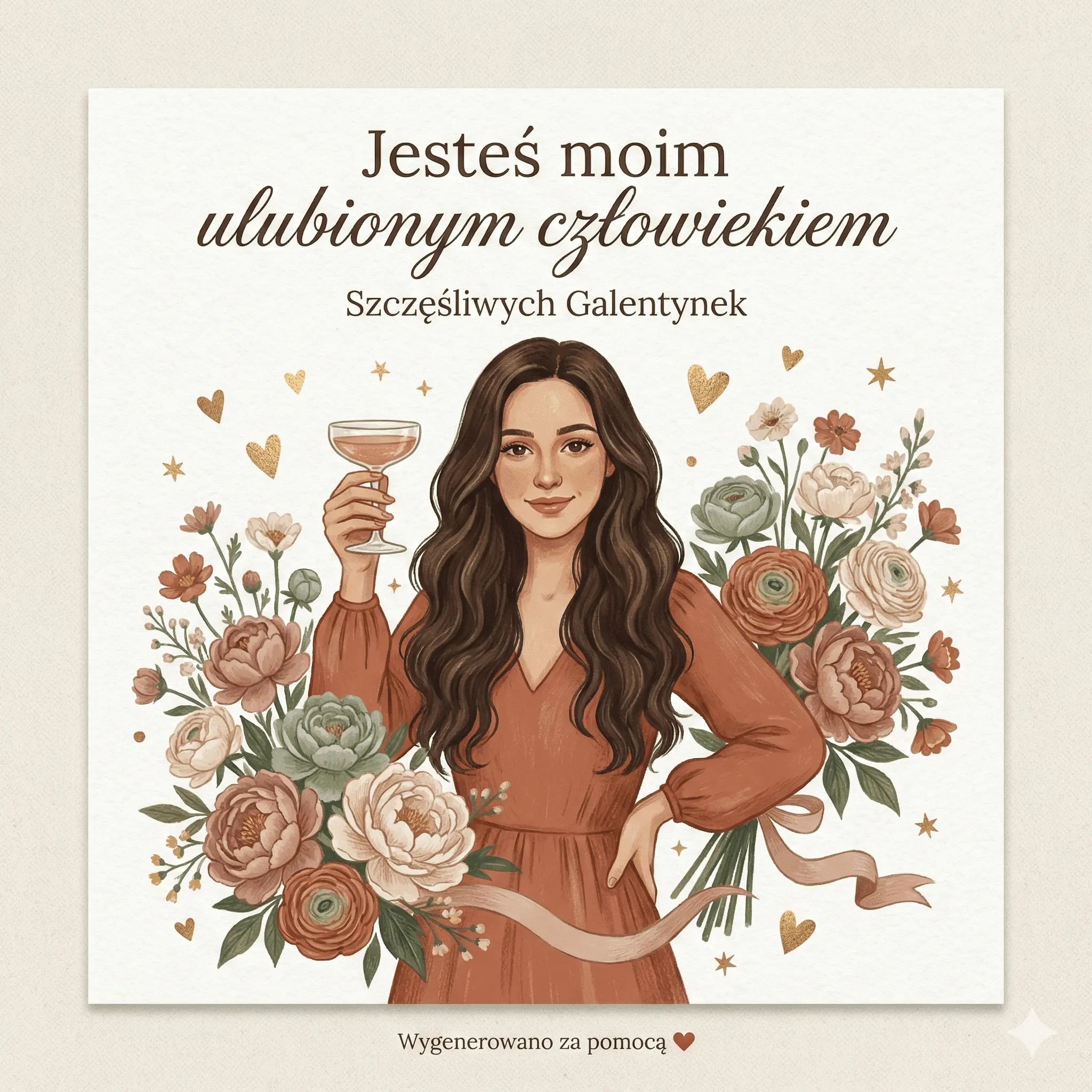 Otocz mnie elementami ilustracyjnymi: przepełnionymi bukietami kwiatów (piwonie, jaskry, kwiaty polne), rozproszonymi serduszkami w kolorze brudnego różu i złota, małymi gwiazdkami i wiszącą wstążką. Paleta kolorów powinna być ciepła, ale nie przesłodzona, z brudnym różem, terakotą, szałwiową zielenią, kremem i akcentami ze złotej folii. W górnej części kartki, w połączeniu czcionek szeryfowych i kaligraficznych, umieść tekst „Jesteś moim ulubionym człowiekiem” z małym podtytułem. Poniżej: „Szczęśliwych Galentynek”. Na dole umieść małą, drukowaną informację: „Wygenerowano za pomocą [czerwonej emoji miłości]”.